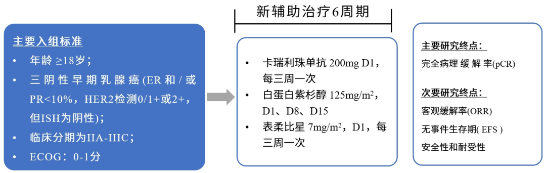 本研究是一项研究者发起的单中心单臂、前瞻性研究(NCT04213898),主要入组标准为:1)年龄≥18周岁;2)病理学或组织细胞学确诊为三阴性乳腺癌患者(ER和/或PR<10%,HER2检测0/1+,或2+,但免疫组化ISH为阴性);3)临床分期为IIA-IIIC;符合条件的患者入组后接受卡瑞利珠单抗以及白蛋白紫杉醇、表柔比星的治疗。主要研究终点为完全病理缓解率(pCR),次要研究终点包括安全性、客观缓解率(ORR),无进展生存期(EFS)等。