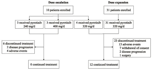 吡咯替尼在剂量400 mg时观察到了3例患者出现剂量限制性毒性(DLT),因此确定吡咯替尼MTD和RP2D为320 mg。在1a和1b期,未发现新的安全性信号。在接受吡咯替尼RP2D治疗的35例患者中,未发生因TEAEs导致的死亡。