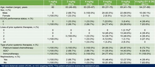 共纳入81例尿路上皮癌患者(6和8mg/kg剂量组中位年龄:65岁);30%以上的患者接受过≥2线既往系统治疗,既往接受过Her2 ADC治疗比例超过35%。