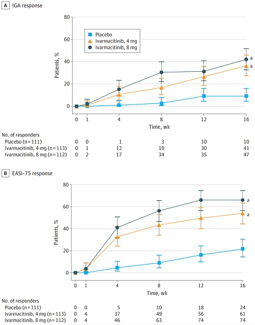在治疗第16周时,硫酸艾玛昔替尼片4 mg及8 mg组的IGA应答率分别为36.3%和42.0%(vs 安慰剂组9.0%;均P<0.001)。同时,硫酸艾玛昔替尼片4 mg及8 mg组的EASI-75应答率分别为54.0%和66.1%(vs 安慰剂组21.6%;均P<0.001)。